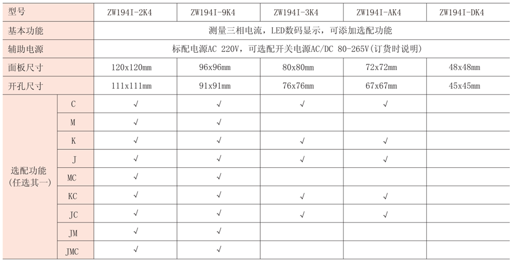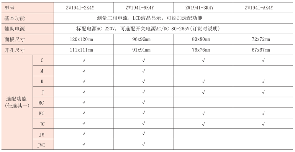 注:“√”代表可選配置,“J”代表報(bào)警輸出,“M”代表模擬量輸出,“K”代表開關(guān)量輸入,“C”代表