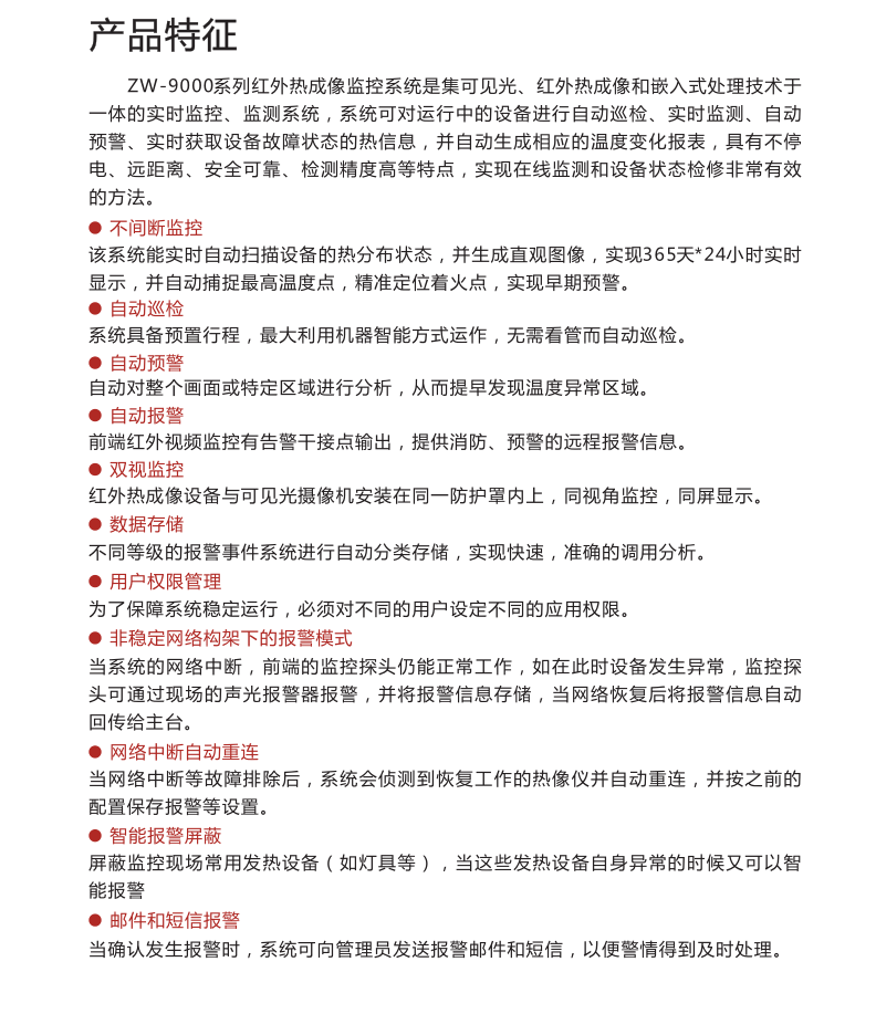 高精度多角度的紅外熱成像畫面判斷碳刷系統(tǒng)的運(yùn)行狀況及周邊風(fēng)溫,并實現(xiàn)報警功能;使用超大規(guī)模組網(wǎng)技術(shù),將電廠所有紅外探測器并網(wǎng)到一個系統(tǒng)內(nèi);超前預(yù)警,對可能發(fā)生的故障信息做出超前預(yù)警;前置紅外探測器能脫離后臺獨(dú)立工作報警;內(nèi)置溫度閥值與溫升速率雙重智能報警分析算法;可預(yù)置工作狀態(tài),生成歷史溫度曲線,將工作狀態(tài)與溫度曲線重疊分析,得到不同工作狀態(tài)下的溫度特性;定時定點(diǎn)對設(shè)備的工作狀態(tài)做出診斷,并生成診斷報告;構(gòu)建數(shù)字化、標(biāo)準(zhǔn)化、智能化的熱成像大數(shù)據(jù)平臺,提供檢測任務(wù)數(shù)據(jù)統(tǒng)計、工作報表展示、數(shù)據(jù)查詢、圖像分析、歷史趨勢分析等豐富的數(shù)據(jù)管理;熱成像技術(shù)智能化與互聯(lián)網(wǎng)化的深度融合,實現(xiàn)本地數(shù)據(jù)與云端數(shù)據(jù)的同步與共享,打破空間壁壘,實現(xiàn)巡檢任務(wù)跨地域管理;預(yù)置工作狀態(tài),生成歷史溫度曲線,將工作狀態(tài)與溫度曲線重疊分析,得到不同工作狀態(tài)下的溫度特性。